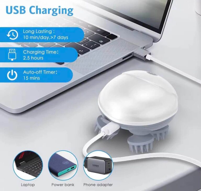 【Portable & Rechargeable】 This electric hair and scalp massager is powered by a rechargeable lithium-ion battery, so there's no need to plug it in when using it. This electric scalp massager comes with a USB charging cable and can be used continuously for 2 hours after being fully charged. Its compact, cordless and portable design allows you to massage anywhere and anytime.